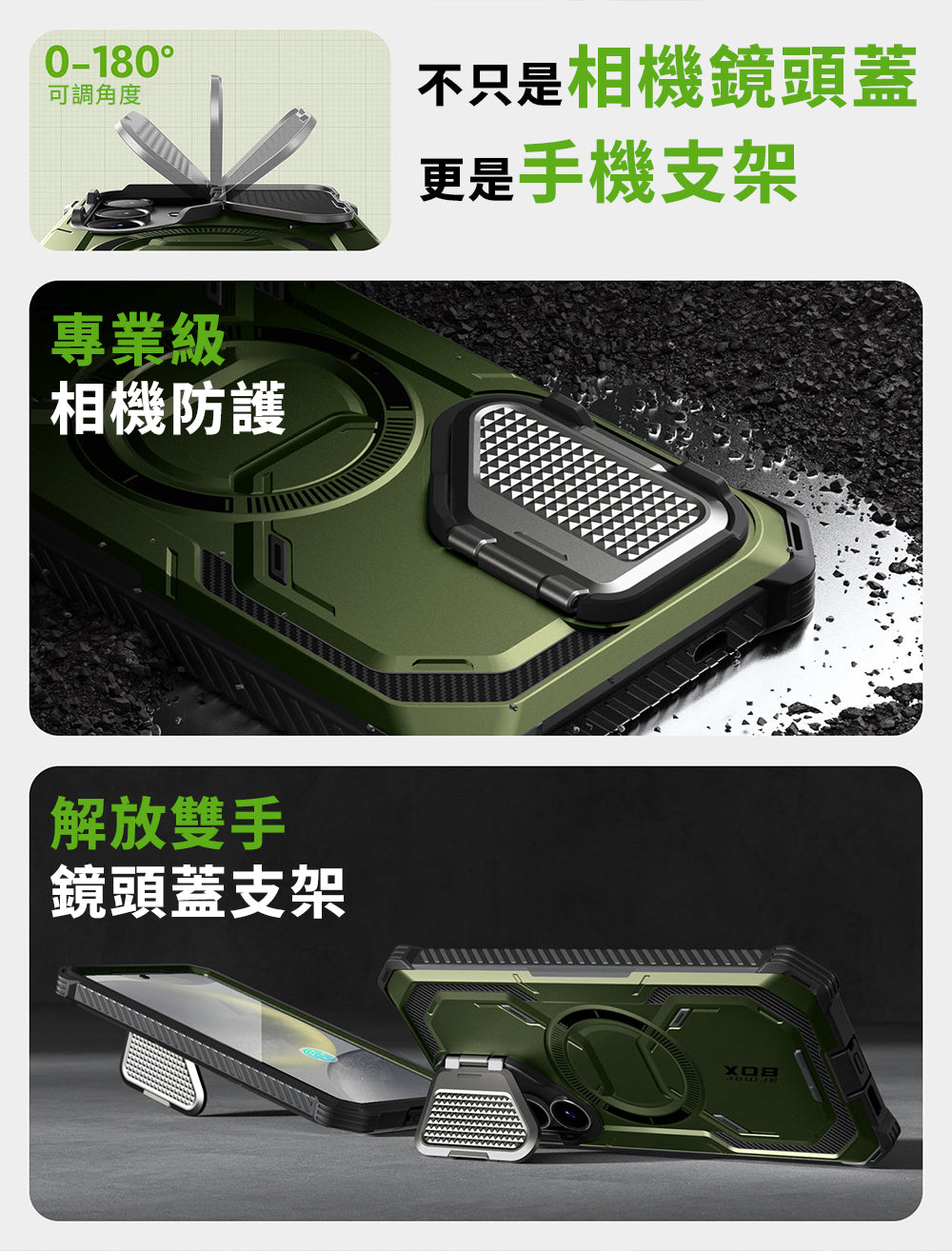 【內置相機蓋兼作支架】鋅合金陽極氧化相機蓋可保護鏡頭,同時兼作支架,提供多種視角。