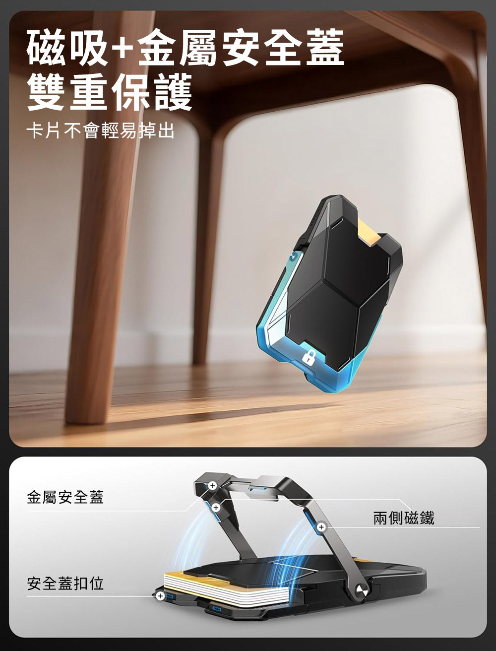 ・金屬鎖蓋固定卡片,可兼作多視角支架