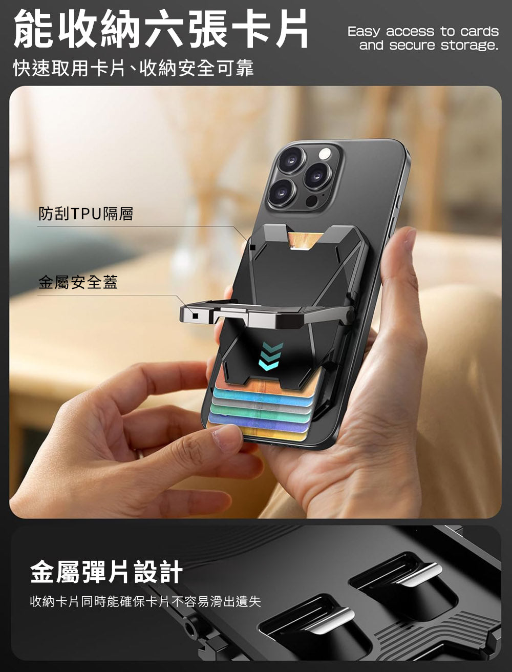 ・金屬鎖蓋可固定卡片,可兼作多角度支架