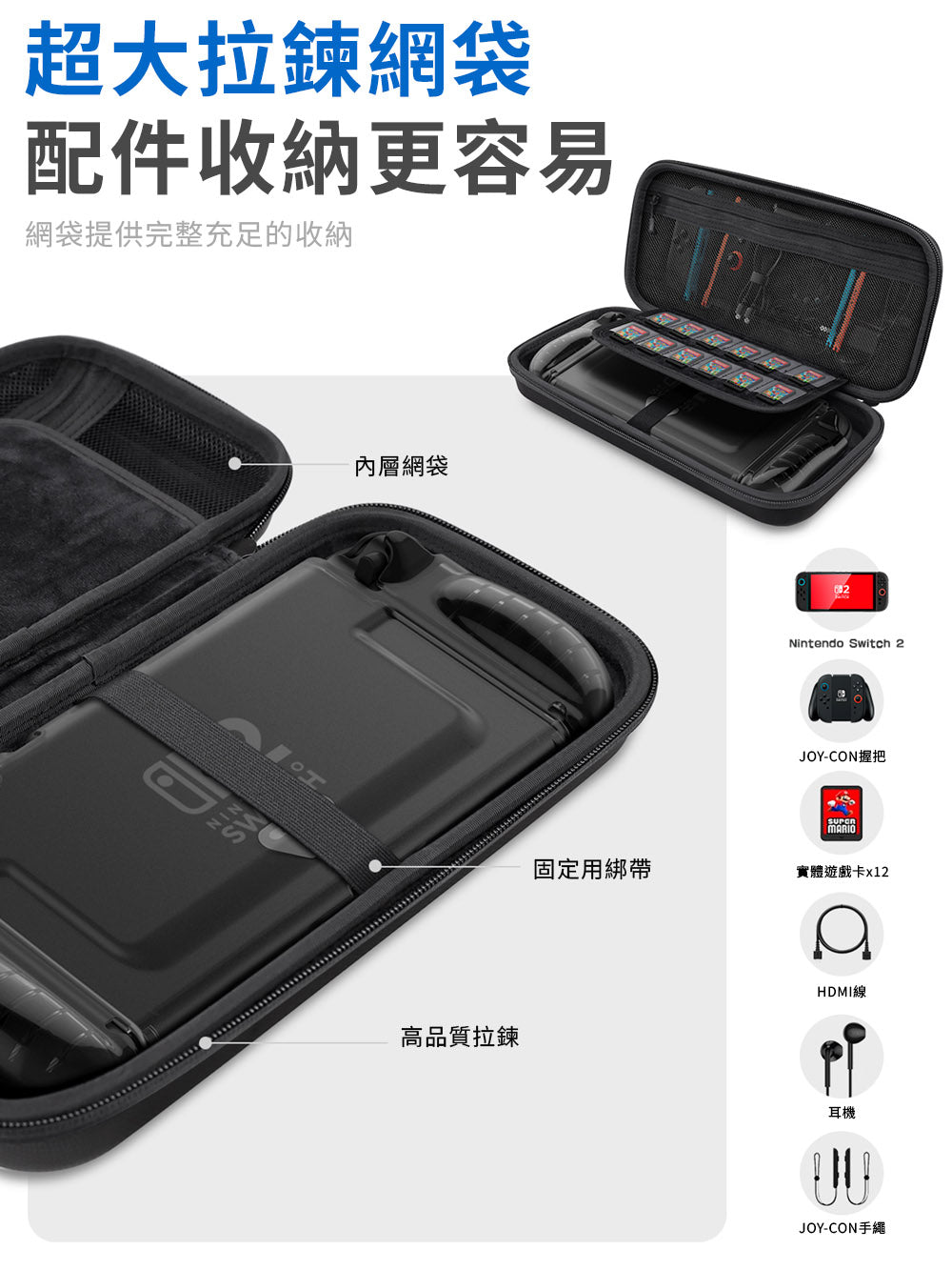 ・內建主機固定帶、12 卡槽、配件網袋,收納整齊