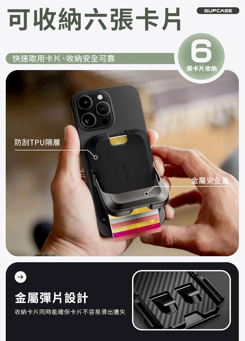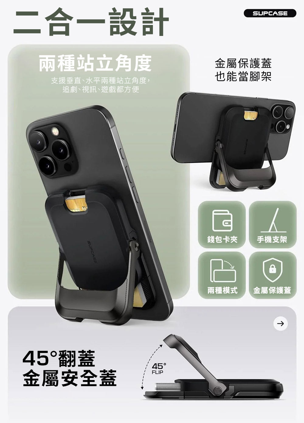 ・內建金屬鎖蓋可固定卡片,同時可兼作支架,提供多種視角
