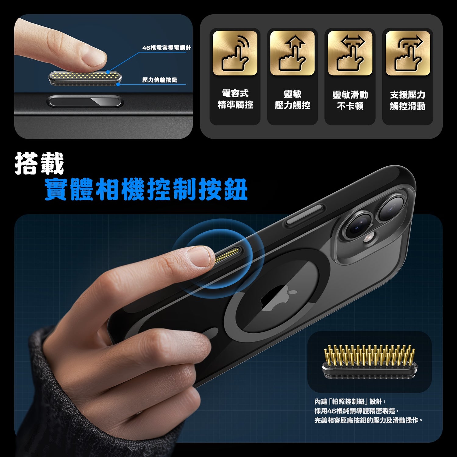 - 相機控制按鍵金屬接點設計,快速啟動、操作相機更方便