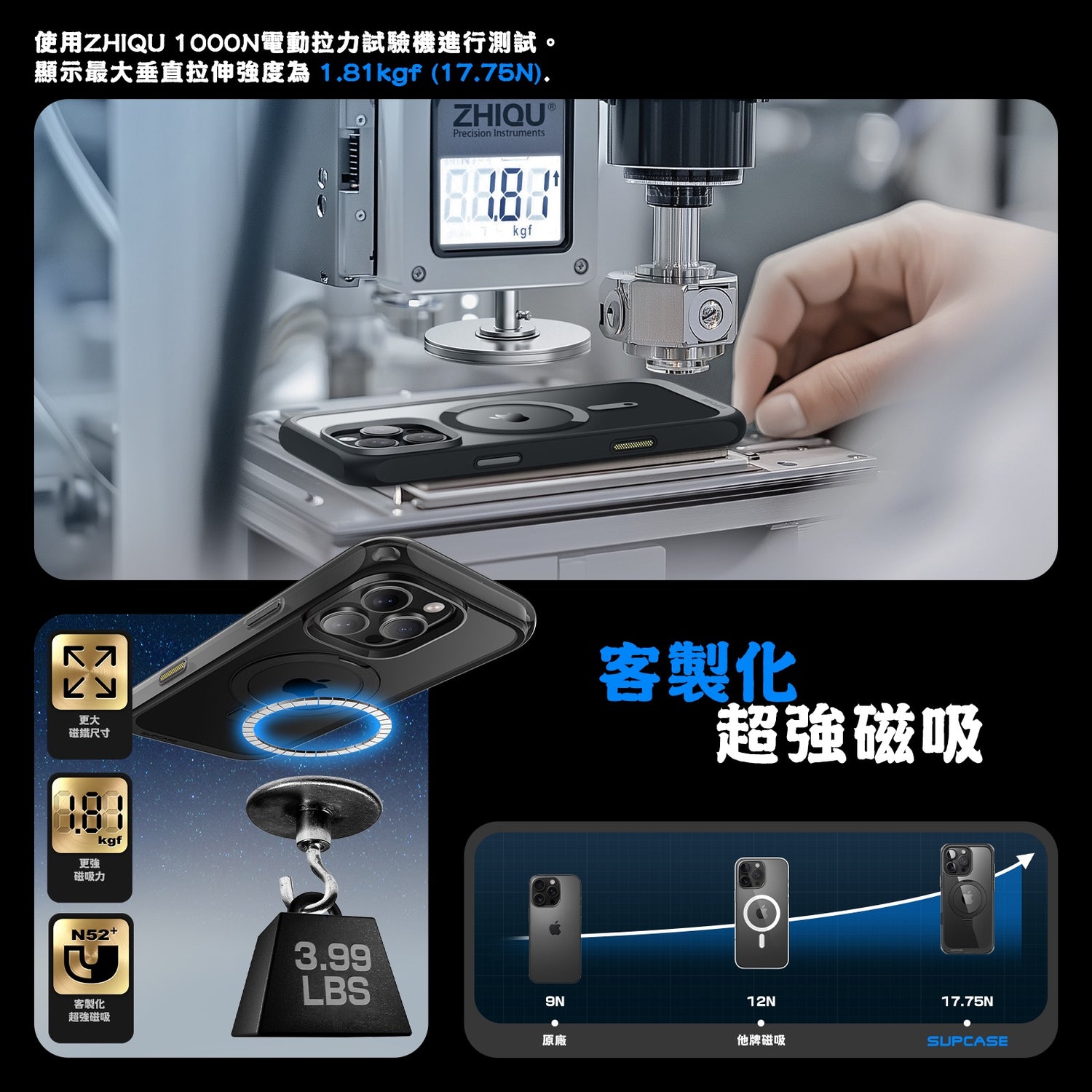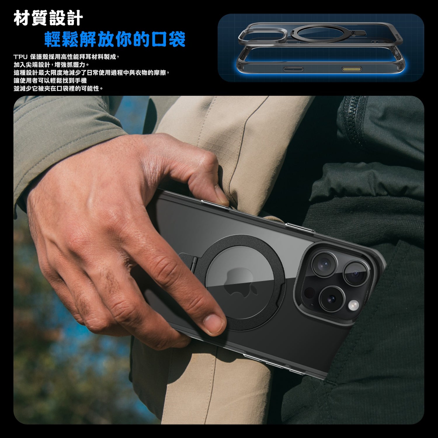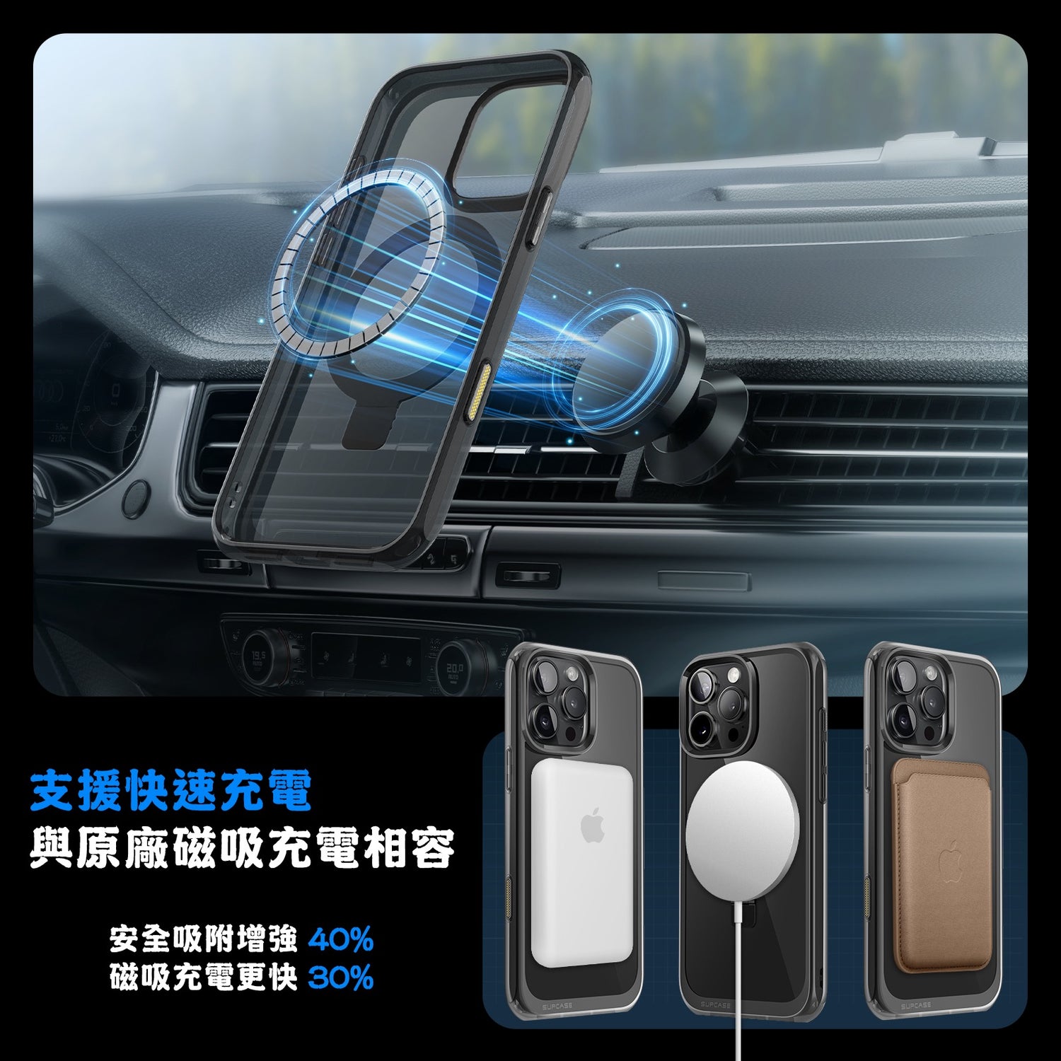 - 背板 N52 強力磁鐵,支援 MagSafe 磁吸,確保配件緊密吸付磁性支架,並支援無線充電