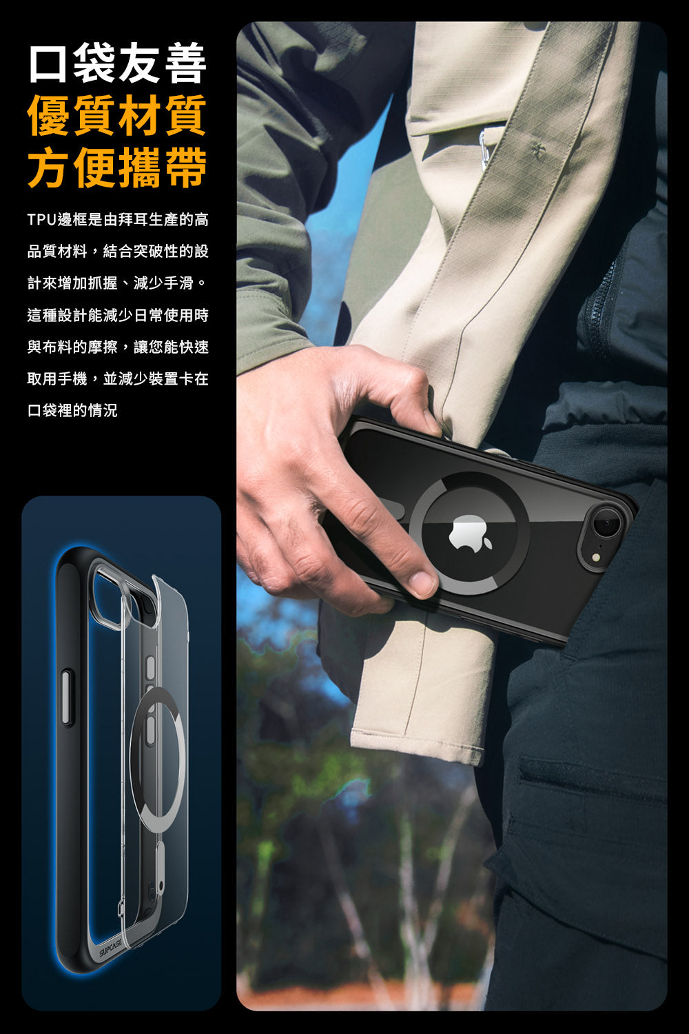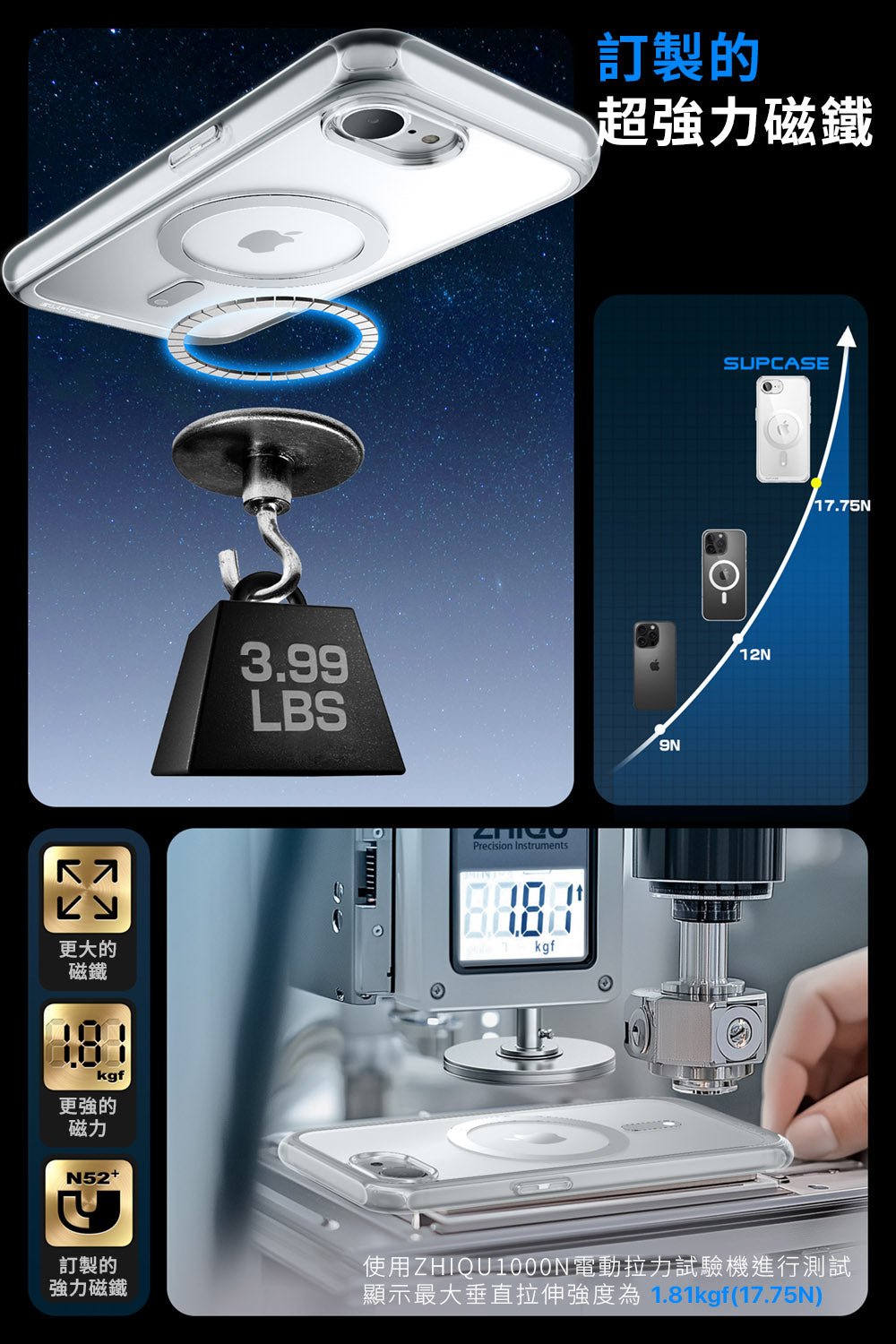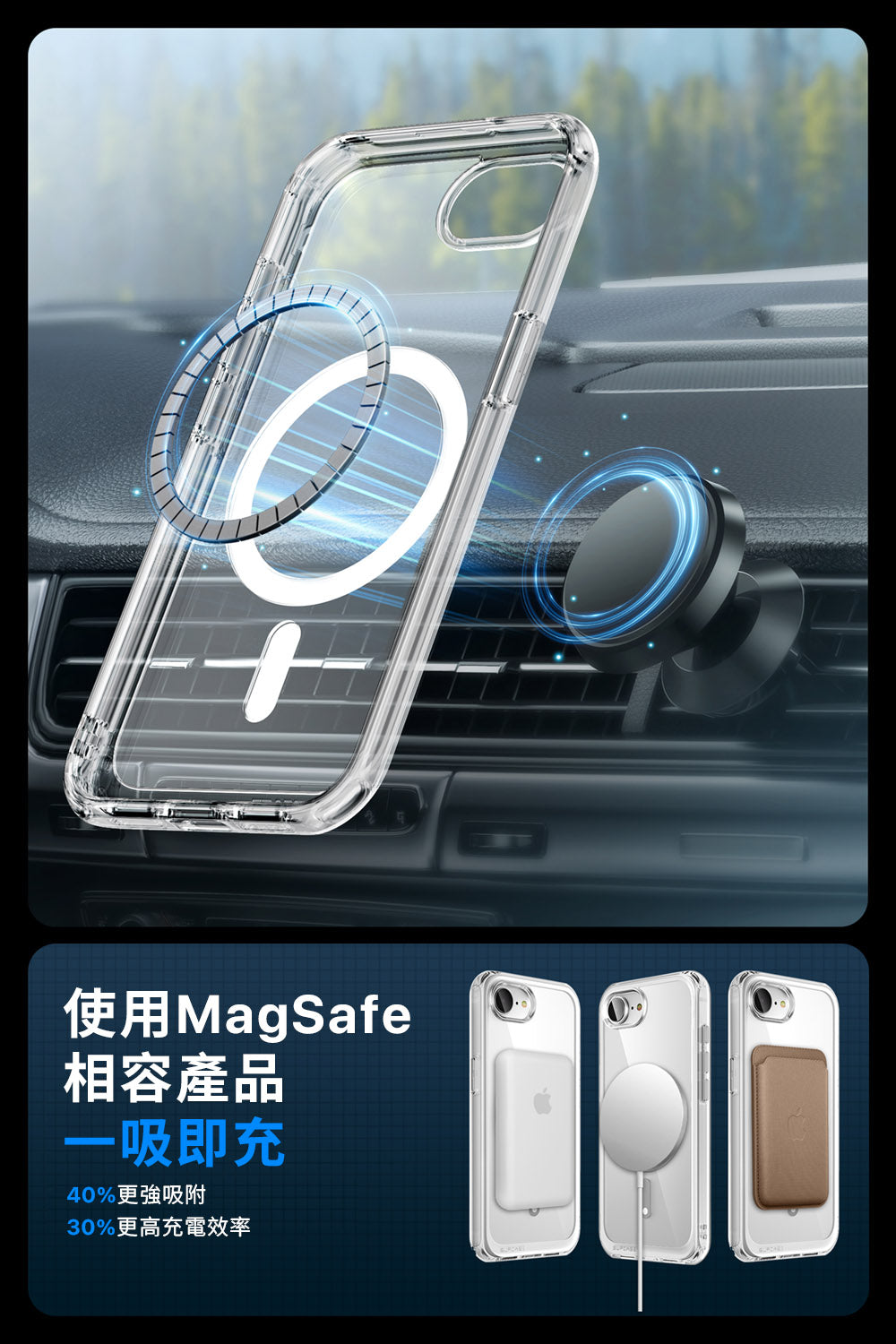 - 背板 N52 強力磁鐵,支援 MagSafe 磁吸,確保配件緊密吸付磁性支架,並支援無線充電