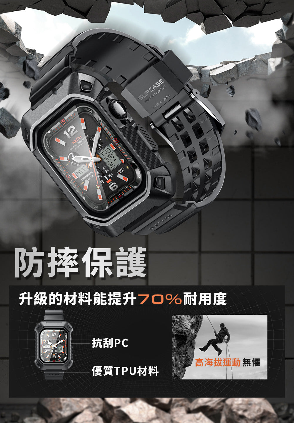 - 20 英尺(約 20 公尺)防摔高度符合美國軍事等級標準。經過驗證的耐用性,戶外活動如運動和遠足,以及建築工地等重型環境。