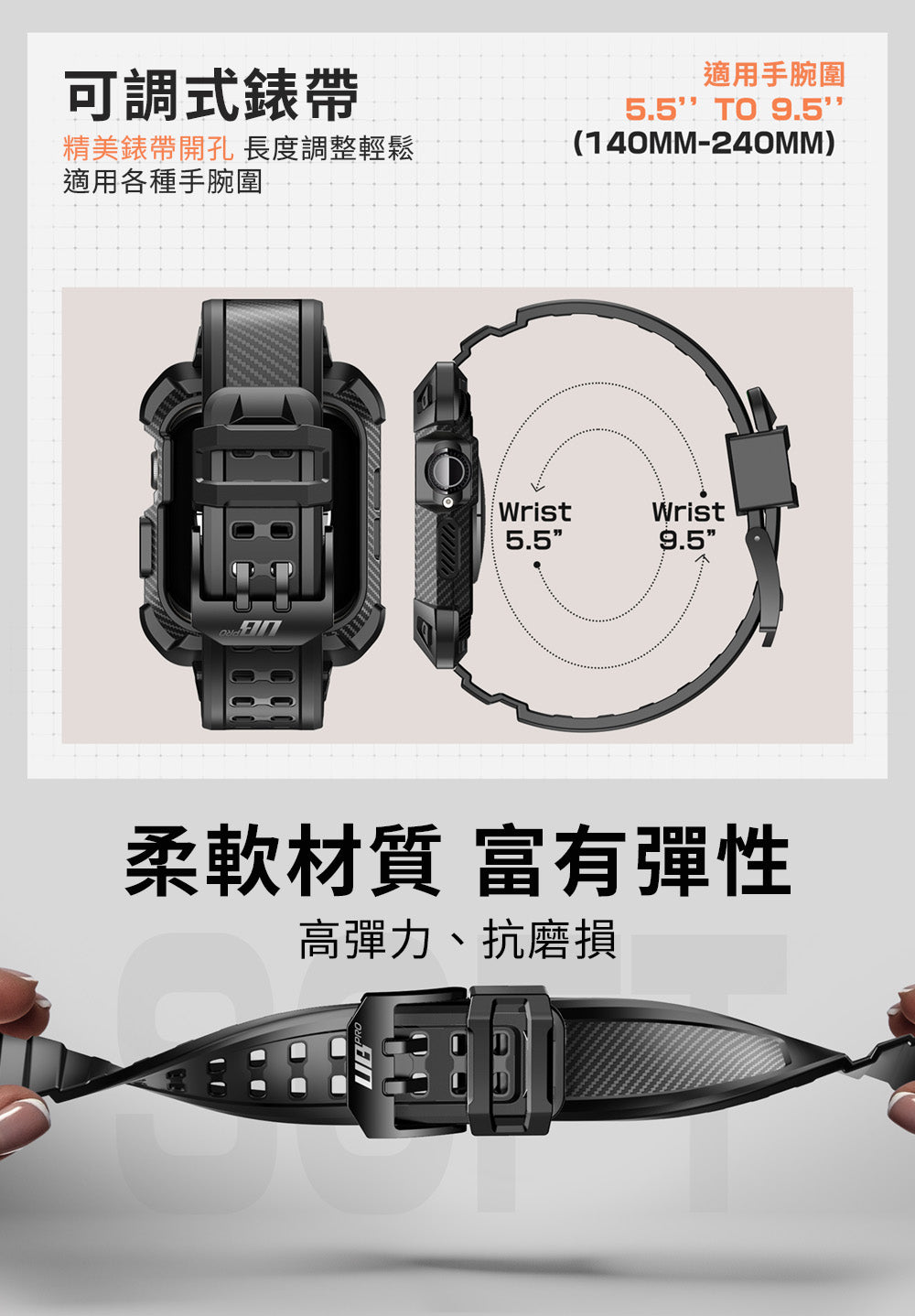 - 可調節的 TPU 錶帶搭配雙舌扣,適合大多數手腕,從 5.5 英吋(約 15.5 公分)到 9.5 英吋(約 15.